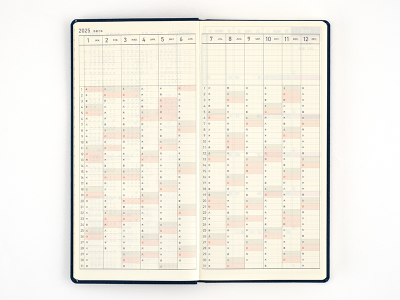 1年分を見開きで一覧できる、長期的な予定管理のページです。ページの上部に7ライン分の自由なスペースを設けました。