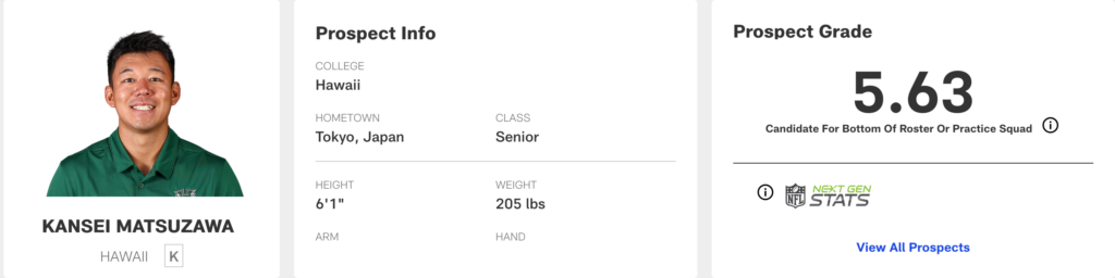 松澤は、東京のステーキハウスのウェイターから、比較的短期間でNFLドラフト候補生へと這い上がってきた男だ。大半のキックにおいて、再現性の高いプロセスとスイングを遂行できる。しかし、爆発的な脚力には欠けており、現代NFLのスタンダードとなっている深い距離からのキックを蹴り込む能力はまだ証明されていない。NFLのロースター入りは厳しい道のり(ロングショット)となるだろうが、彼の持つその正確性は各チームの興味を惹きつけるはずだ。