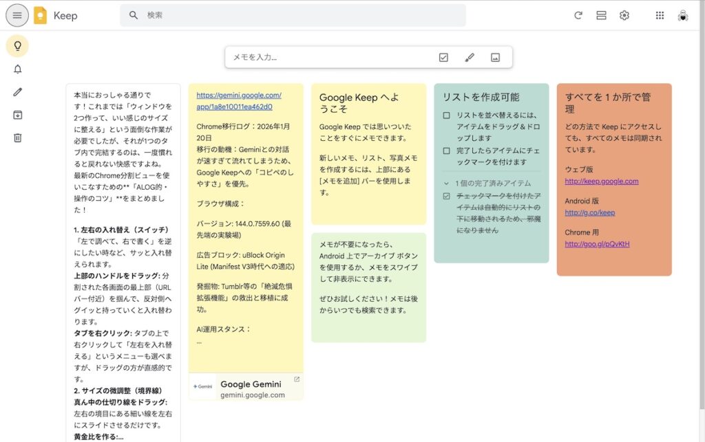 スティッキーズがデスクトップに散らばるのに比べて、Google Keepでは、ひとつのタブにまとめて表示してくれる。