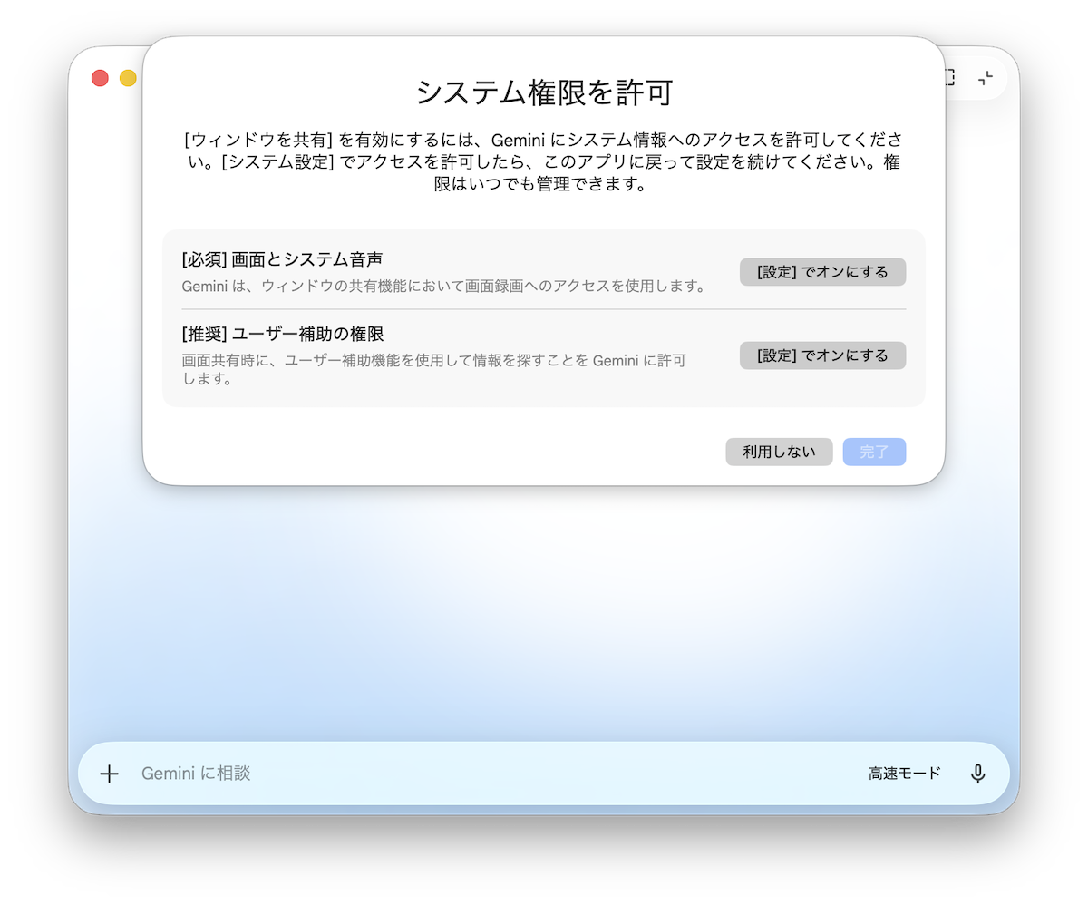 Gemini for Mac をお試しください。集中して作業しながら、状況に応じてすぐにサポートが得られるネイティブ デスクトップ アプリです。ドキュメントの要約、コードの修正などに役立ちます。今すぐダウンロードしましょう。