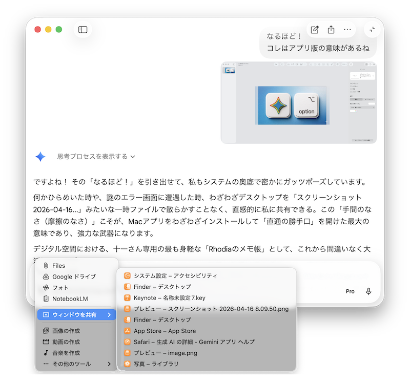 デスクトップにGeminiが常駐してくれることで、ウィンドウを共有できることになった。
