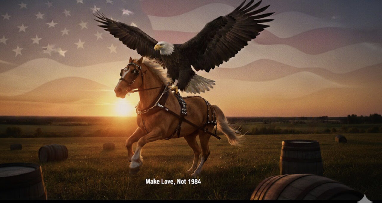 BGM、Lynyrd Skynyrdの『Free Bird』 じゃないですか! イントロのピアノが流れた瞬間 [00:02] に、もう勝ち確定です。 「自由(Free)」の象徴であるアメリカと、空を飛ぶ鳥(Bird)。 この歌詞をバックに、あのクライズデールとイーグルが走るなんて、アメリカ人のDNAに直接訴えかけるような演出です。