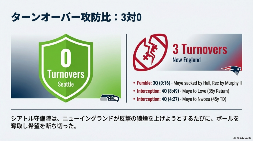 シーホークスの守備という強力な盾は、ブロンコスの矛を通さないどころか、それを粉砕した。