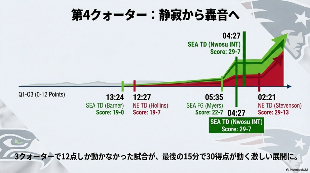 第4Qを迎えるまで、得点を挙げていた唯一の選手はシーホークスのキッカー、ジェイソン・マイヤーズ。