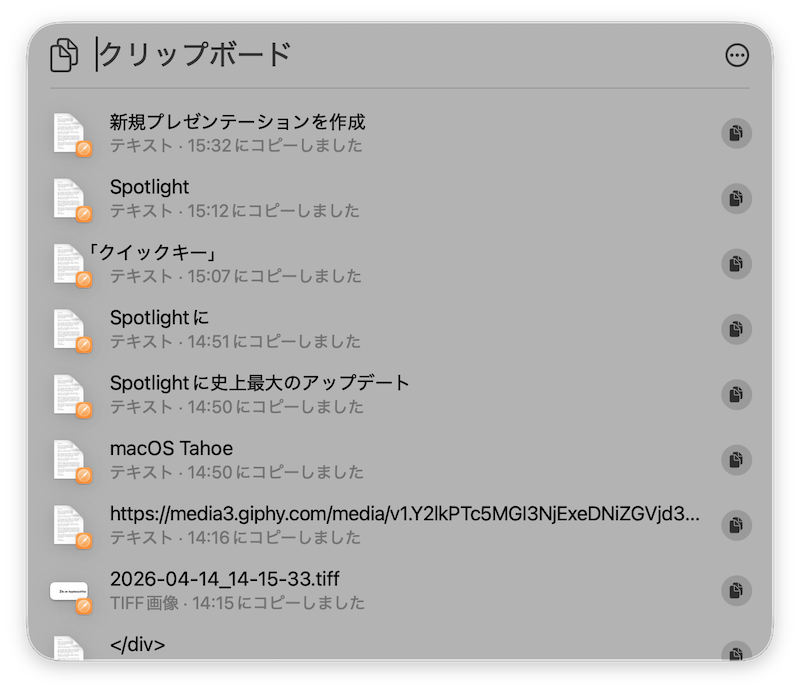 面白くなってSpotlightを探ってみると、クリップボード ⌘4には履歴が保存されている。