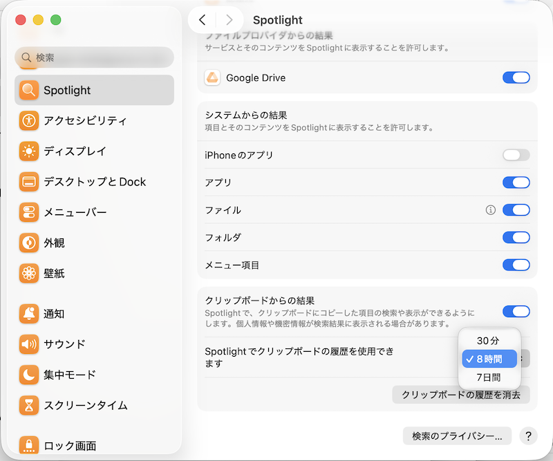 設定>Spotlightで履歴の保存期間も、30分・8時間・7日間の3種類から選択可能だ。